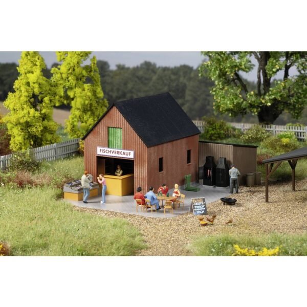 Een kleiner, uit hout bestaand bijgebouw met aanbouw herbergt een visverkoop, passend bij de artikelen 11 474 en 11 476. De met toonbanken, rekken, uitlaten en een weegschaal ingerichte verkoopplaats…