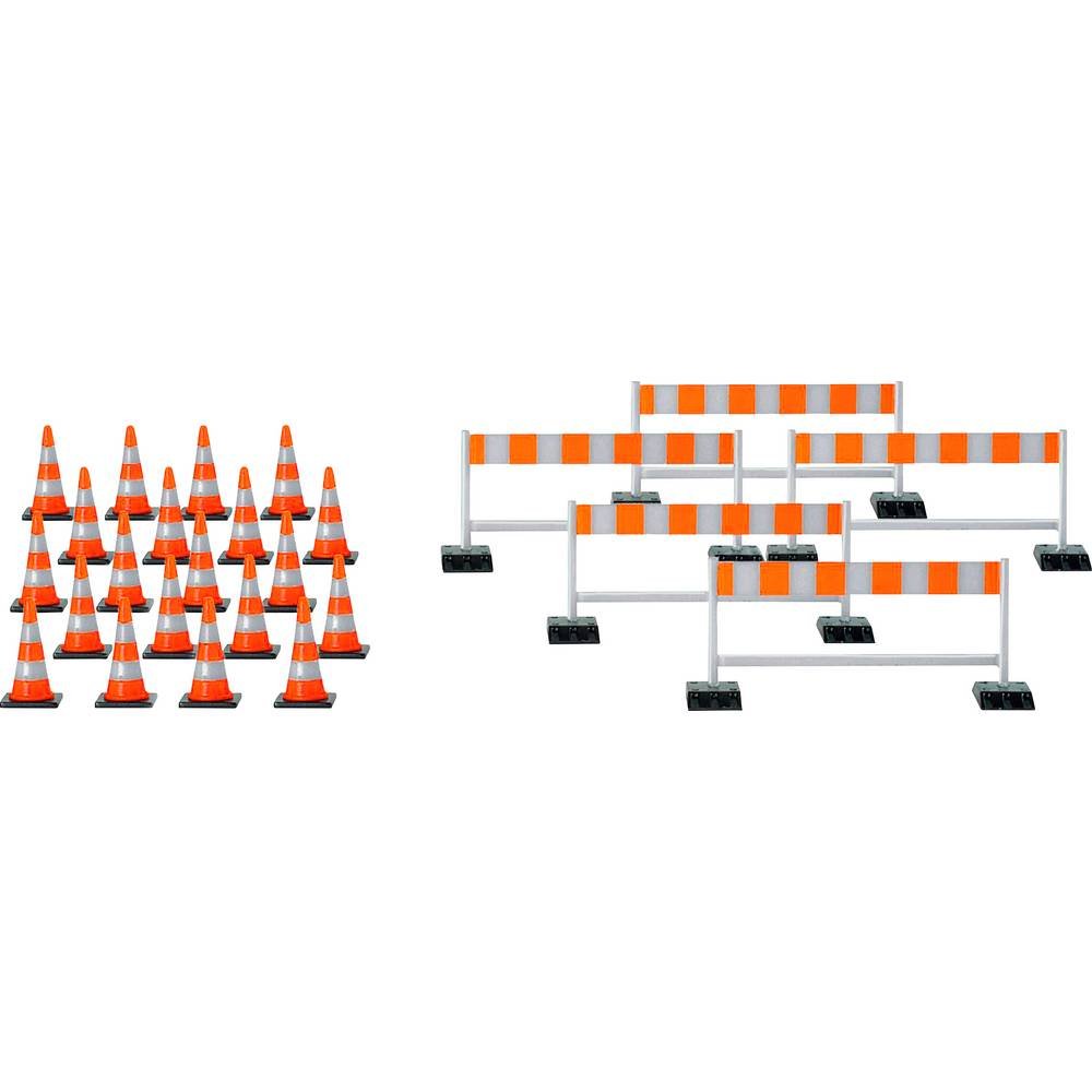 Bouwplaats? Daarvoor zijn natuurlijk ook afsluitingen nodig. De set bevat 20 pylonen en 5 afsluitsloten in wit en rood om de „kunststof uitvoering” te „simuleren”.