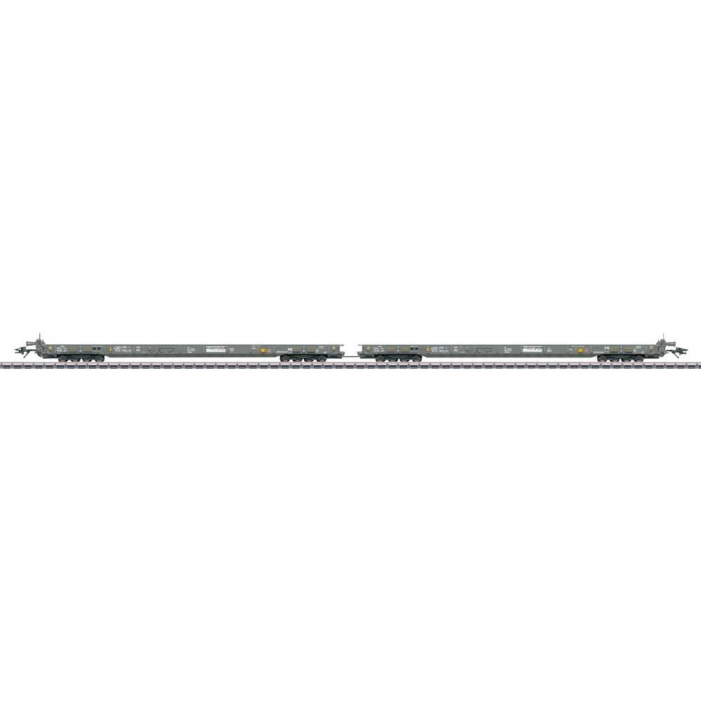 Voorbeeld: twee lageboordwagens type Saadkmms van RAlpin AG (Olten), voor het transitverkeer op de ‘Rollende Landstraße’. Kwartsgrijze basisinkleurstelling. Bedrijfstoestand vanaf 2018.model: Opbouw…