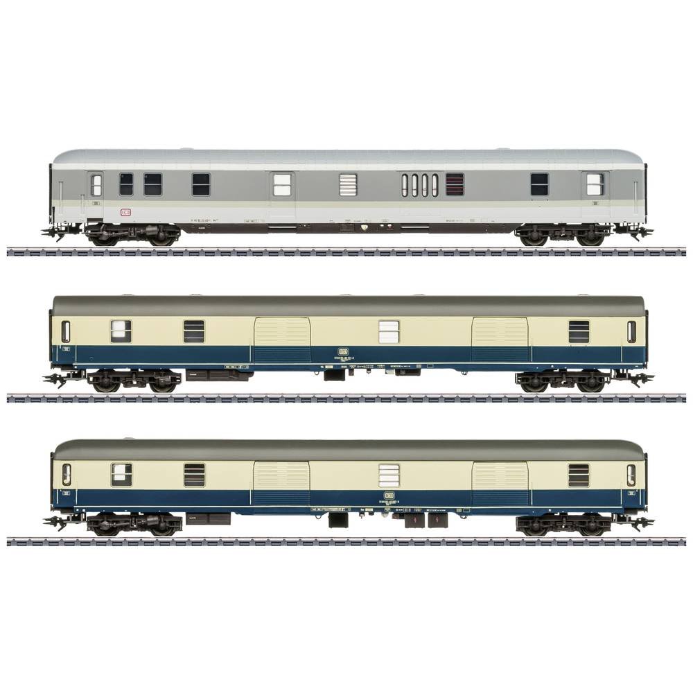 Voorbeeld: Drie bagagerijtuigen van verschillende types van de Deutsche Bundesbahn (DB). Een bagagewagon DM 903 in productkleurstelling, een bagagewagon DMS 905.0 met steile daken in oceaanblauw/ivoor…
