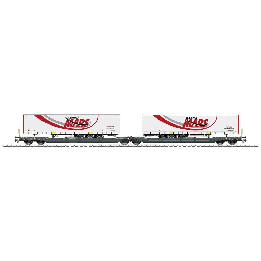 Voorbeeld: 6-assige dubbele zakwagen met scharnier van het type Sdggmrss met gebogen zijvlakken van MFD Rail GmbH Moderne draagwagen voor gecombineerd vrachtverkeer. Granietgrijze basiskleurstelling….