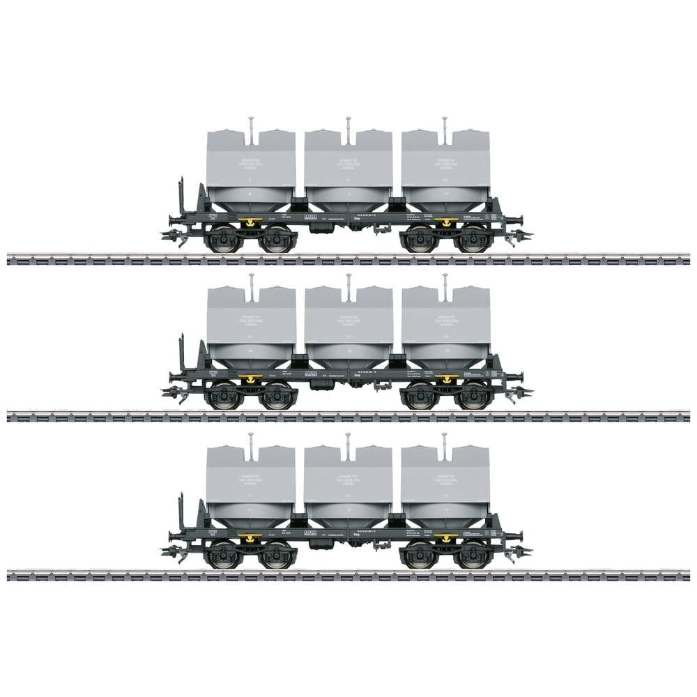 Voorbeeld: Drie vierassige kalkkuipwagens van het type Slmmp voor het transport van nat gevoelig stortgoed. Zwarte landingsgestel met lichtgrijze kuipen. Particuliere wagon van de VEB chemische…
