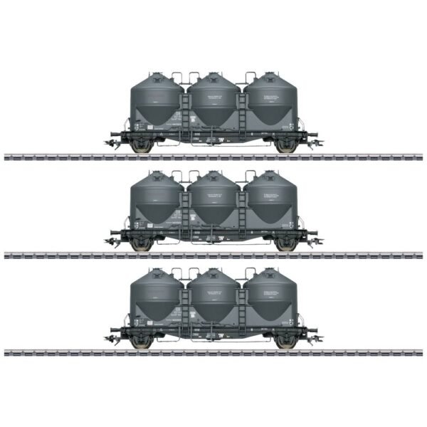 Voorbeeld: Drie tweeassige filowagens van het type Kds 67. Uitvoering met elk drie donkergrijze silocontainers. Deutsche Bundesbahn (DB). Zoals in gebruik in tijdperk III.