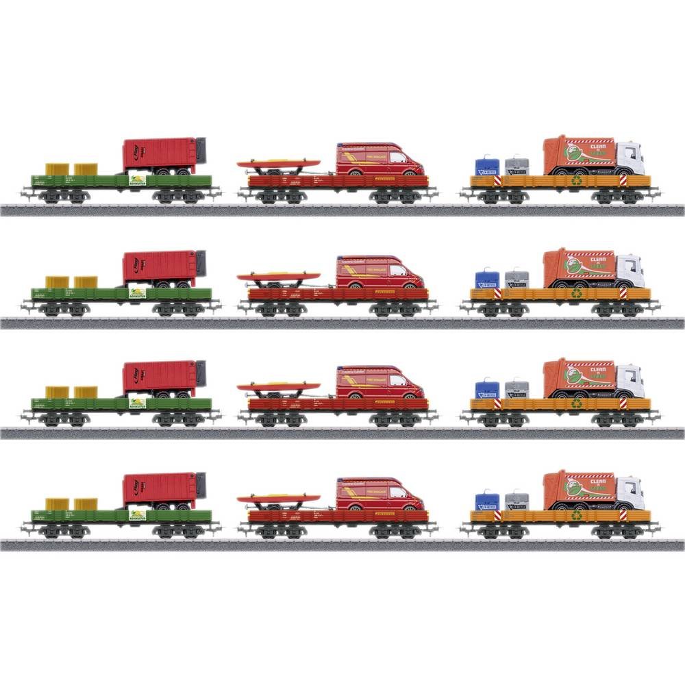 Voorbeeld: 12 vierassige laagboordwagens type Rlms in fictieve, thematische vormgeving. De wagens zijn met verschillende voertuigen beladen.