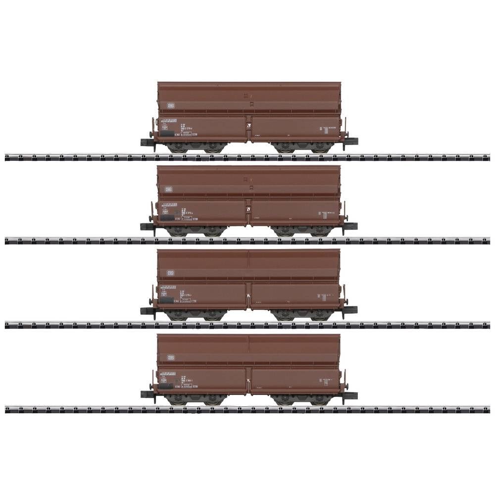 Voorbeeld: 4 vierassige zelflossers van het type tal 963 (Kkt-62) van de Deutsche Bundesbahn (DB). Uitvoering met twee ontlastkleppen per lengtezijde en een remplatform aan de kopse kant. Wagons met…