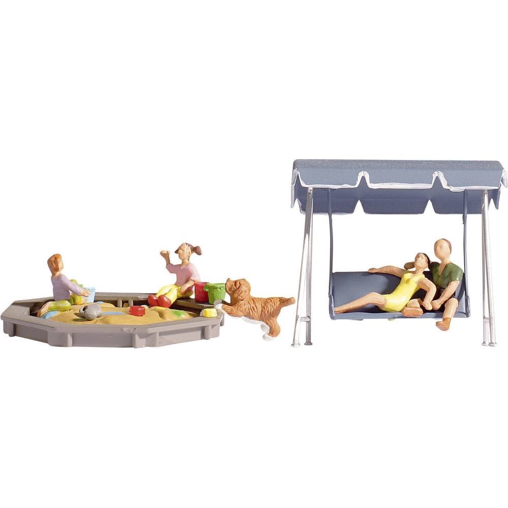 Twee ouders, 2 kinderen en een hond (allen beschilderd) die zich zo te zien prima vermaken met resp. de schommelbank en de zandbak. Ideaal voor een scène in een achtertuin….