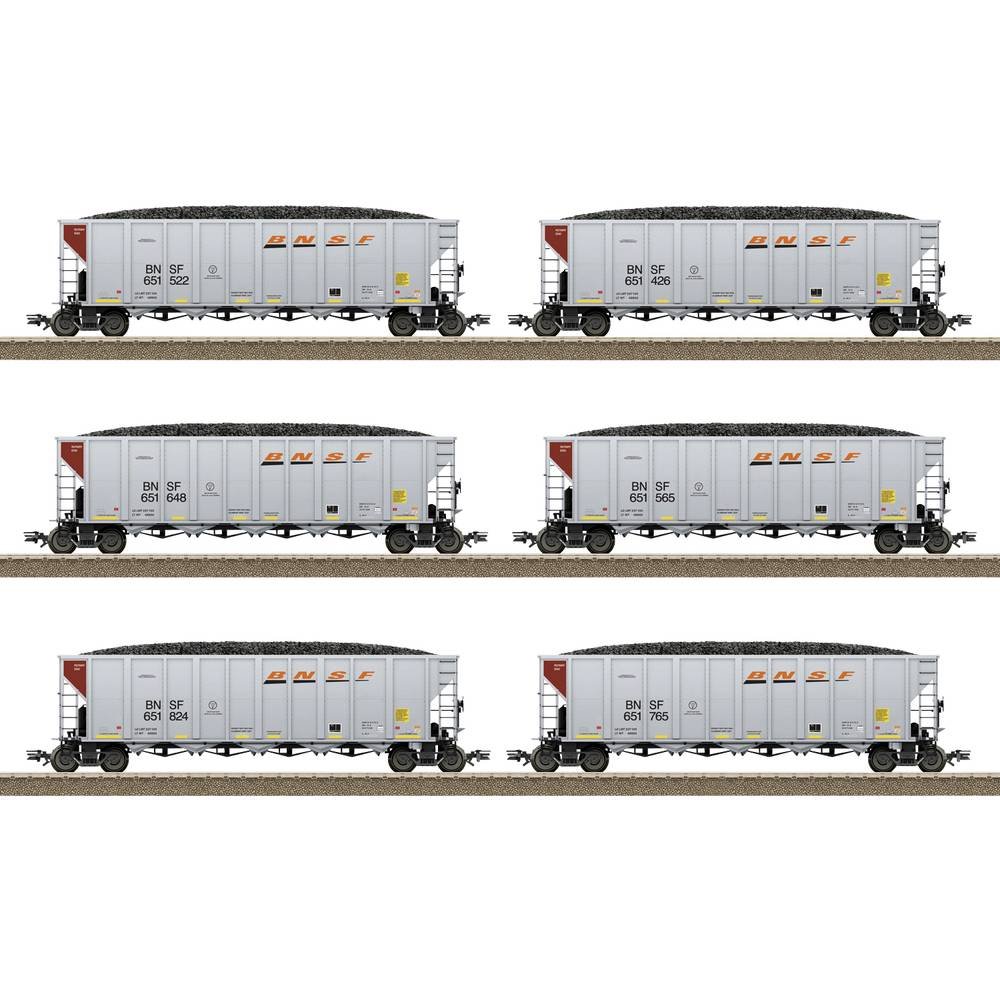 Voorbeeld: Zes kolentransportwagens, zogenaamde hopper Cars, de Burlington Northern Santa Fe, LLC (BNSF). Uitvoering met vijf ontlaadinstallaties op de wagenbodem. Zoals momenteel in bedrijf….