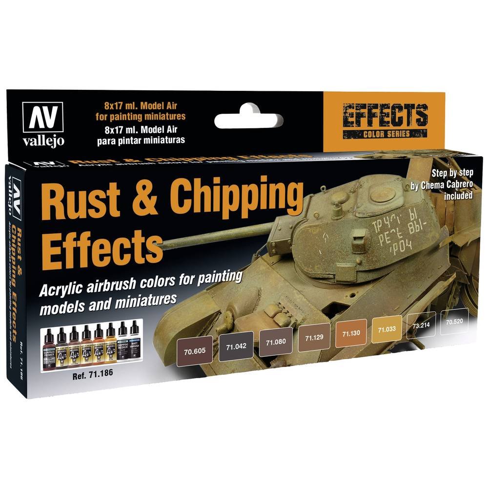 Keuze uit airbrush-kleuren voor het genereren van roest- en slijtageeffecten, veroorzaakt door weers- en vechtomstandigheden. Inclusief stap voor stap handleiding van Chema Cabrero.